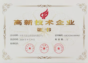 2020年9月9日——河南大張過濾設備有限公司榮獲“高新技術企業(yè)”證書